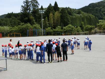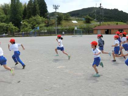 昼の時間に児童体育委員会が全校遊びを企画してくれました。本当は「かげ踏み」をする予定でしたが、曇っていたので「鬼ごっこ」に変更になりました。逃げる子たちは白の帽子、鬼は赤の帽子です。