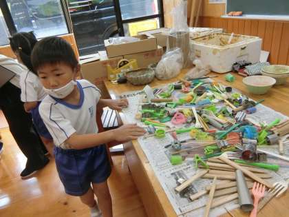 どんな道具を使おうかな。へら、スプーン、フォーク、クッキー型、シャボン玉を吹くストロー。子どもたちは思い思いの道具を選んで、作品に模様をつけています。