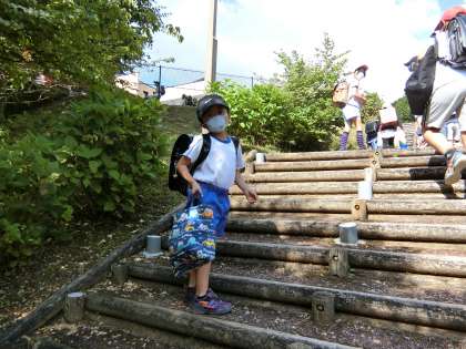 低学年の子はまだ背が小さいので、普通に手提げ袋を持つと、バスを降りる時にぶつけてしまいます。声をかけると、みんな手提げ袋を上の方に持ち上げて上手にバスを降りていきました。