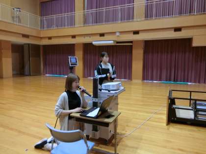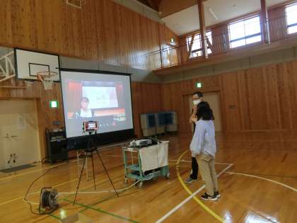 体を動かす内容であることと、もともと保護者の方も参加される予定であったことから、密を避ける意味でも、タブレットを使ってリモートで場所を分けて集会を行うように計画していました。3か所にタブレットとスクリーンを設置してリハーサルをしています。