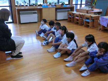 1年生教室では保健の先生が読み聞かせをしました。最初の「おねがいします」のあいさつもしっかりできました。どんなお話かな?ワクワクしますね。