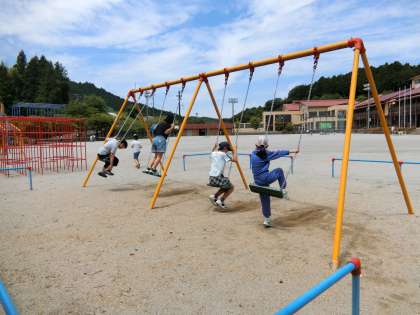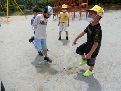 職員室前テラスで気温と暑さ指数を気にしていると、1年生の男の子が二人、元気よく走ってきました。運動場に「ふん」を発見したので見にきてほしいと言います。何度も何度も熱心に誘うので、はい、……見に行きました。