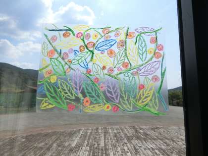 2年生教室のそばに、透明シートに描かれたきれいな絵を見つけました。2年生の担任の先生がクレヨンで描きました。透き通ったガラスの向こうに青空が見えます。すてきです。