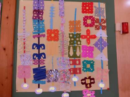 1年生の子たちが はさみで切った「ちょきちょきかざり」もきれいです。
