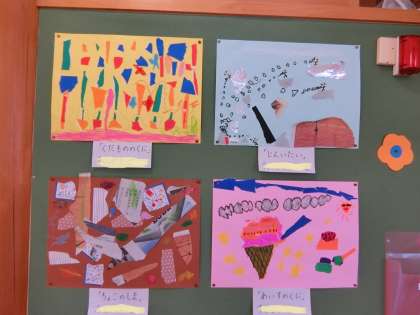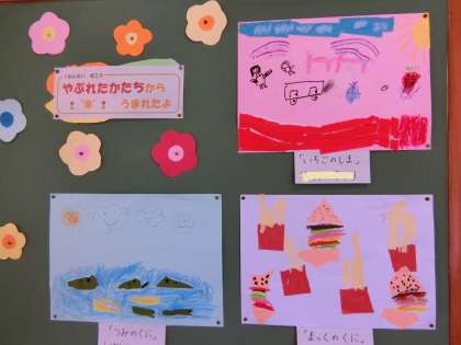 1年生の図工作品です。「やぶれた かたちから うまれたよ」という単元です。発想を広げて子どもたちが作りました。自由な発想で形と遊ぶのは楽しかったでしょうね。作っているときの子どもたちの表情やつぶやき、担任の先生とのやり取りが目に浮かぶようです。