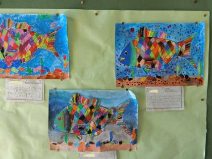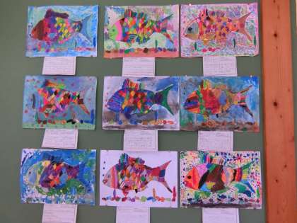 2年生教室の前に貼ってある子どもたちの作品です。子どもたちは「こんな魚がいたらいいな」をイメージして色を塗りました。本当に、こんな魚がいたらいいね。
