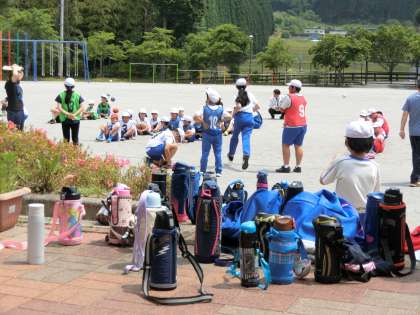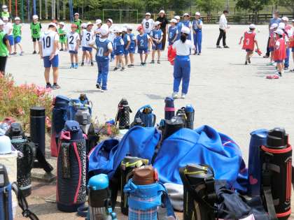 子どもたちはマスクを外し、涼しい服装で水筒を持って集合です。5色のビブスをそれぞれつけています。今日の全校体育はどんな楽しい企画でしょうか?