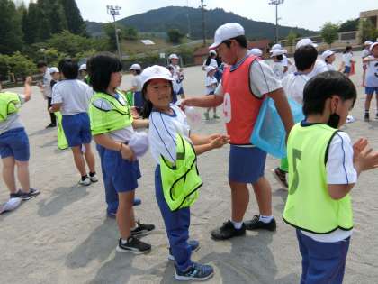 ボールを当てられた人が少ないチームが勝ちです。1位は黄色チーム、2位は緑チームでした。楽しい企画を考えてくれてありがとう。全校体育のあとはそのまま昼放課になりました。委員会の子が一人一人の手に消毒もしてくれました。みんな、とても楽しそうでした。次回も楽しみにしていますね!