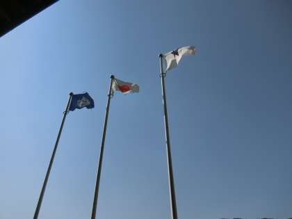 子どもたちが登校してきました。委員会の子たちがさっそく旗を揚げてくれました。青空に映えます。
