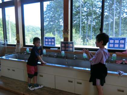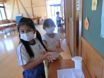 子どもたちは、バスの中ではマスクをします。あじさい坂を登る時はマスクを外します。校舎に入る時はマスクをつけます。登校してきたら手洗いとうがいをします。教室入り口のアルコール容器に手をかざして消毒をします。