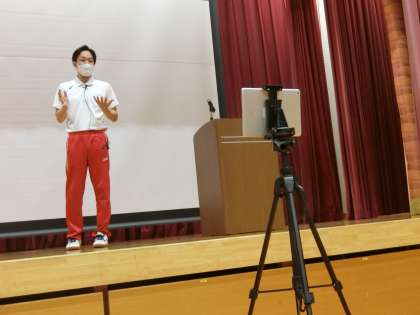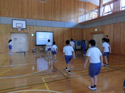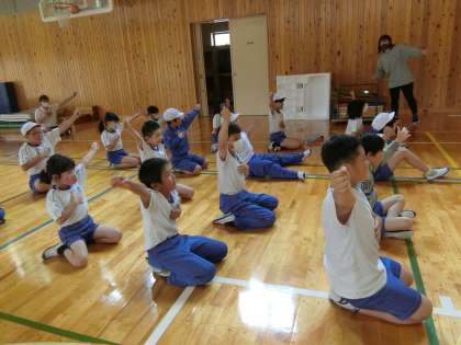 保健委員会の発表のあとは「コーディネーショントレーニング」です。講師の先生をお招きして楽しく体を動かすトレーニングをします。はじめは座ったままで簡単な動作をします。でも、頭を使わないと間違ってしまいます。