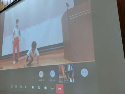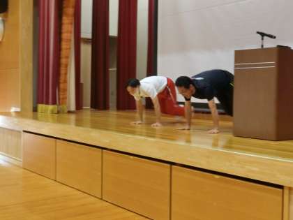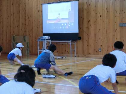 トレーニングの途中でスクリーンに先生や子どもも登場しました。難しい動きが上手にできるのを見て、全校から拍手と歓声が上がりました。