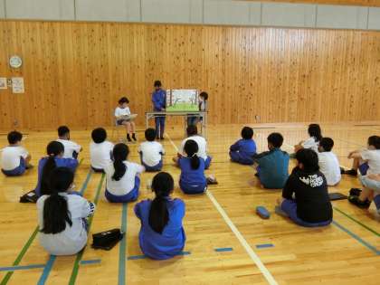 こちらは体育館で行われている高学年の読み聞かせです。図書館司書さんもこうした活動を支えてくださっています。