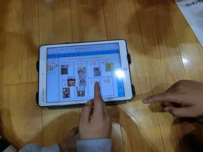 読み聞かせのあとは、学年縦割りで8チームに分かれて「人気本ランキングクイズ」を行いました。回答の仕方はタブレットを使います。