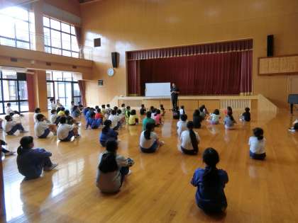 昼の時間に全校集会を行いました。集会のはじめは、いつもの「ハンカチ&爪チェック」です。手の清潔は大事です。子どもたちには、きれいなハンカチを自分で持ってくる習慣を身につけてほしいです。