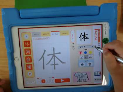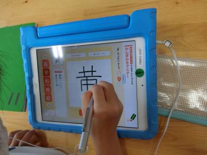 2年生の教室をのぞきました。漢字や計算の学習をタブレットで行っていました。漢字の練習では、タブレットが書き順も教えてくれます。書き順に気を付けてきれいな字で丁寧に書いていました。