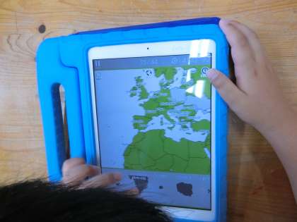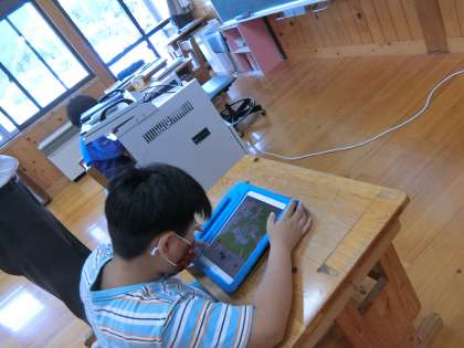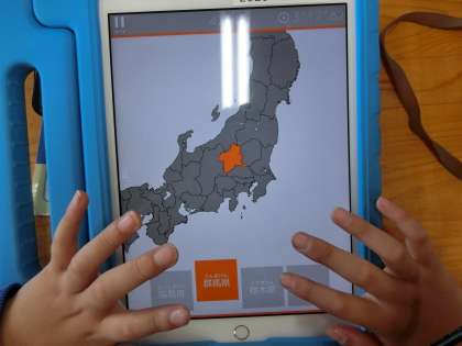 ともえ学級の授業参観の様子です。ともえ学級はタブレットを使った算数の計算やローマ字入力のトレーニングなどを日ごろからよく行っています。今日は地図アプリを使って県の名前や国の名前を選んで地図に当てはめていく活動をしていました。私も知らない国があったりして、よく知っているなあと感心しました。