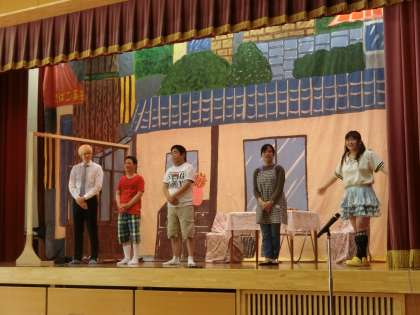 ファニーチャップのお二人が漫才で会場を和ませてくれたあとは、喜劇団・笑劇波の「情報モラル劇」を観ました。下山出身で巴ケ丘小学校卒業生の伊藤みこさんも、お母さん役で登場です。楽しい劇を通して、LINEやSNSで悪口を言わない、ゲームやスマホのルールを家庭でしっかり話し合って決める、インターネット(You Tubeなど)はお家の人と時間を決めて一緒に観るなど、大切なことを学びました。