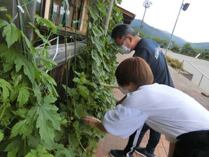 「キュウリが大きくなりましたね」「ツルがまた伸びたね」校長室前のプランターで教務主任先生と保健の先生が植物の生長を見ています。先生たちがプランターに植えた野菜の苗は、子どもたちの理科の観察に役立っています。