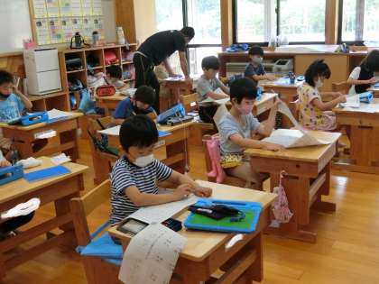 2年生教室の朝の学習の様子です。子どもたちは漢字プリントで漢字の確認をしていました。間違いやすい漢字を、先生が黒板に書いて確認していました。タブレットでも勉強します。「答」という漢字を書いている子がいたので、私もペンを借りて書いてみました。