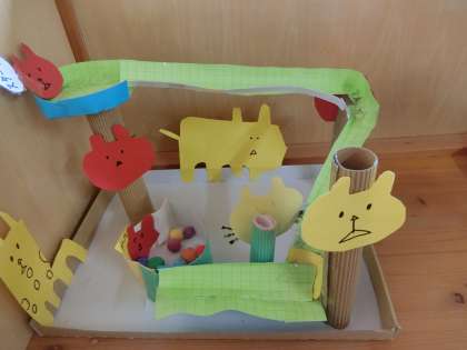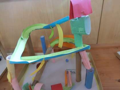 4年生教室前の廊下に、図工作品が置いてありました。カラフルな造形用の紙で作った仕掛けに、ビー玉を転がして遊ぶ作品です。子どもたちはこういう造形活動が大好きです。何を作ろうか、どんな仕掛けにしようか、きっとわくわくして作ったと思います。ビー玉を借りてちょっと転がしてみました。ゴールまでうまく転がって嬉しい気持ちになりました。