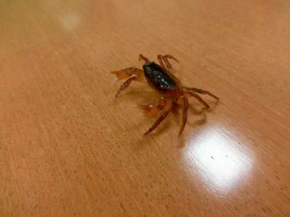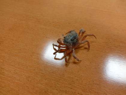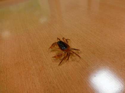 校務主任の先生が「多目的室にカニがいました」と教えてくれました。手に持った封筒の中には、ほこりまみれの沢ガニが一匹入っていました。どこから室内に入ってきたのでしょうか。カニの体と顔(…そういえば、カニはどこからが顔でしょうか?)にほこりがべったりついていてかわいそうだったので、手にのせて校長室の水道できれいに洗いました。洗われたカニは怒ってはさみを広げていましたが、すっきり、さっぱりしました。