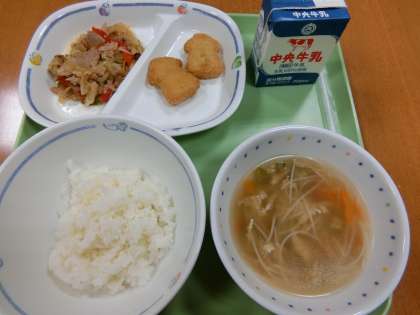 今日の給食です。たなばた献立です。季節や行事にちなんだ献立を給食センターが工夫してくれています。今日の献立表によると、この汁物は「たなばた汁」だそうです。そうめんが入った汁です。外は雨が降り続いています。