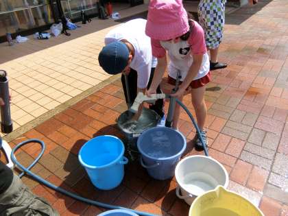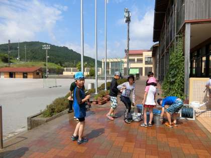 時折、本格的な夏の到来を思わせるように太陽と青空が顔をのぞかせます。職員室前テラスで子どもたちが何か活動を始めました。元気の良い歓声が聞こえます。何でしょう。