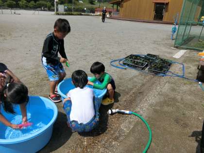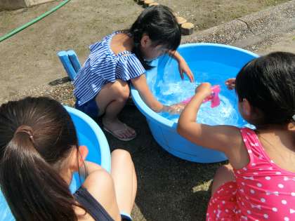 ウサギ小屋のあたりでは、1年生が手作りの舟をたらいに浮かべたり、水鉄砲で遊んだりしています。生活科の単元「なつとなかよし」の活動です。このあと、6年生が1年生と一緒に水鉄砲で遊んでくれました。理科の実験で外に出ていた4年生も加わり、先生たちも一緒に水浸しになって水遊びを楽しみました。