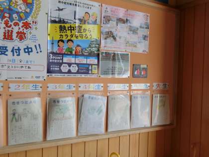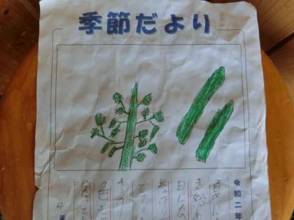 おはようございます。昨日の夕方も雷鳴が長く続きました。梅雨が明けそうで明けません。子どもたちの靴箱の入ってすぐのところに「季節だより」が掲示してあります。上の写真の絵は先生が描きました。季節感いっぱいの季節だよりです。