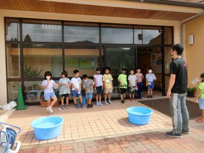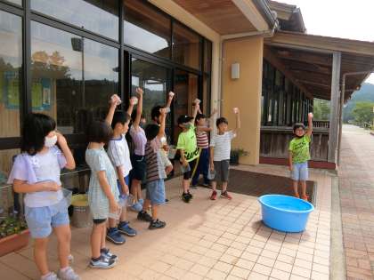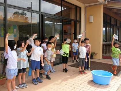 4年生に続いて2年生も外に出てきました。水遊びでしょうか?手にそれぞれ容器を持っています。