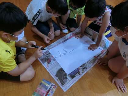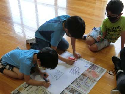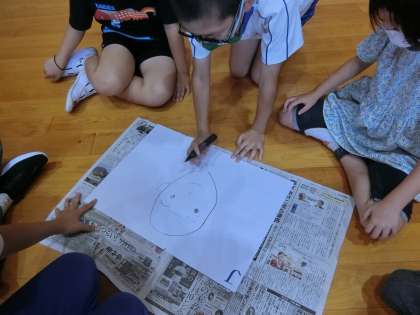委員会の子たちが、昼の時間に全校遊びを企画してくれました。今日の全校遊びは多目的室でお絵かきです。縦割りの学年で組んだグループで、「ともえがおか」から連想するものを順番に線を書き足して絵を描いていきます。相談なし、無言で行うのが約束です。チームワークの良さを競います。