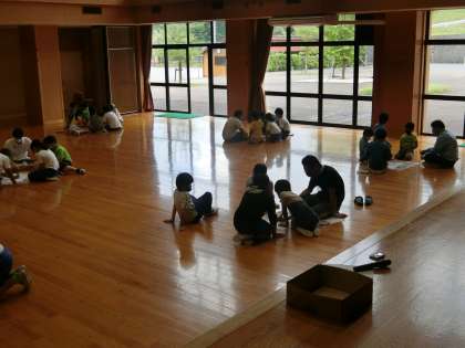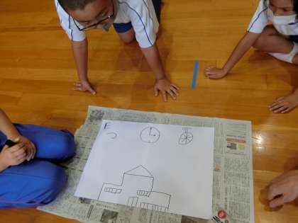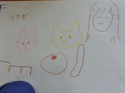 校舎、遊具、うさぎ、スクールバス、一輪車。今、夏野菜が育っているので、よく見るとキュウリやトマトの絵もあります。子どもたちが描いた絵でいちばん多かったのが「校舎」、次は「うさぎ」。私の絵を描いてくれた班もありました。「ぼくたちの班は『笑顔』の絵を描きました」と紹介した班もありました。毎回の全校遊びは工夫が凝らされた内容で、子どもたちが楽しみにしています。次回は何かな!?