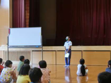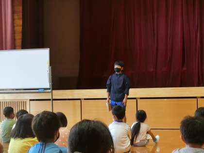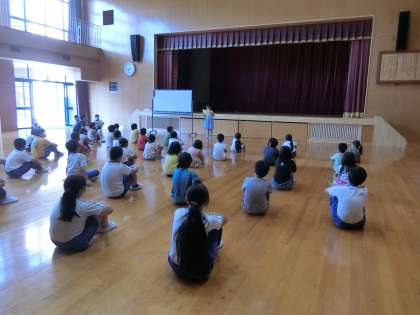 朝の時間を使ってお話集会を行いました。毎月行っているお話集会です。いつもは2学年で組んで、お話に対して質問したり意見交換をしたりするのですが、今日は全校集会の形で6名の子が「今がんばっていること」「夏休みに頑張りたいこと」などについて発表してくれました。