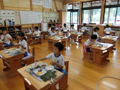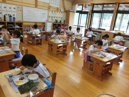 2年生は12名。学校でいちばん児童の数が多い学年です。夏休み前までは全員前を向いて黙食でしたが、より一層の安全対策ということで、いろいろと考えた結果、教室いっぱいに離れて外側を向いて食べるようにしました。静かに食べています。もちろん両側の窓や出入り口は開放しています。