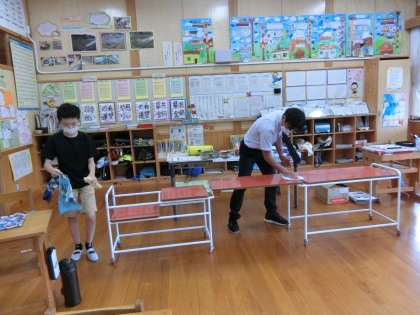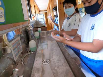 4時間目が終わった時に、子どもたちはすぐに手洗い場に行き、念入りに石鹸で手を洗っていました。指の間、爪の部分までしっかり手が洗えたようです。教室では先生が配膳台の消毒作業を行っています。