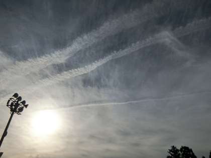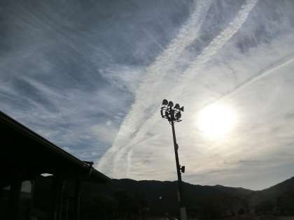 今朝の空には、ひこうき雲が3本、消えずに残っています。ひこうき雲がなかなか消えないのは、空の水蒸気の量が多いせいだそうです。ということは、お天気は下り坂。明後日の運動会に向けて、今日と明日の空模様が怪しかったので、練習や準備を前倒ししました。週間天気予報よりは意外とお天気が持ちそうです。とにかく土曜日は晴れそうです!