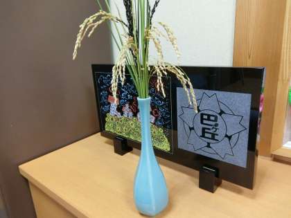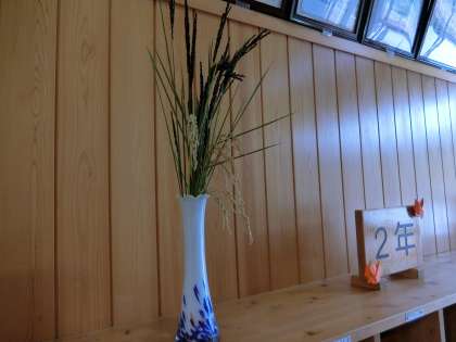 午前中にいただいた稲穂を飾りました。学校にも実りの秋がやってきたようです。丹精込めて育てられた稲穂をくださって、ありがとうございました。