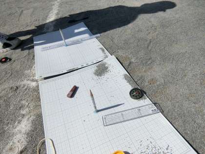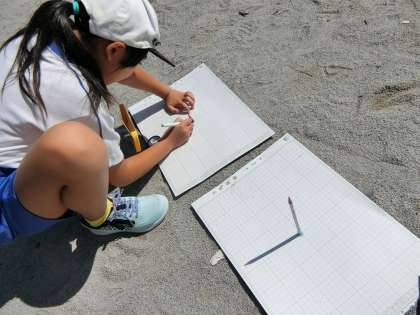 3時間目、3年生が運動場で理科の観察をしていました。方眼紙と鉛筆、太陽を見る遮光板、方位磁石を使って太陽の位置とかげの向きや長さを調べます。