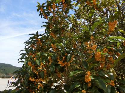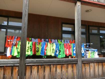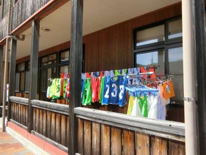 運動会で子どもたちが使ったビブスが保健室前のテラスに干してありました。保健の先生に感謝です。キンモクセイの花が満開です。キンモクセイは桃のようなおいしそうな匂いがします。秋ですね。