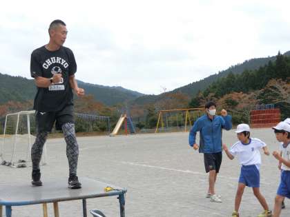 青戸さんに御指導いただいている様子です。運動の基本は、テクニックの前に、まずは基本的な姿勢や柔軟性だということが分かりました。走る前のトレーニングもとても参考になりました。先生たちも興味津々、子どもたちと一緒にトレーニングです。