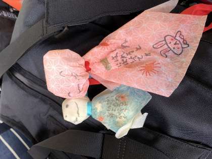 1日目は電車で移動です。朝早くに駅に送ってくださったおうちの方、ありがとうございました。子どもたちはドキドキしながらも、みんなで助け合って、無事、切符が買えました。みんな元気に全員参加の修学旅行です。低学年の子たちが作ってくれたテルテル坊主も一緒です。
