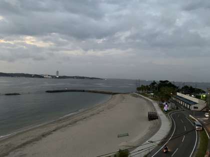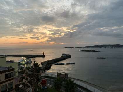 海と夕陽が綺麗です。目の前が砂浜です。あとでこの浜で花火をします。