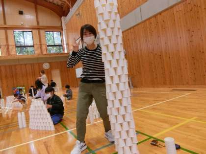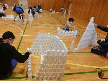 まずは一人200個使って、体育館いっぱいに広がって好きなものを作ります。時間は10分!先生たちも夢中です。