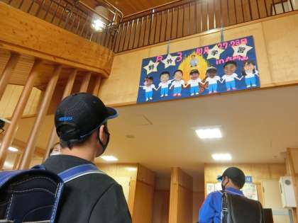 子どもたちが見上げる先には、またまた先生たちからのサプライズです。来週に迫った5年生のキャンプに向けて、先生たちがパネルを作って飾ってくれました。5年生の子たちはニコニコして喜んでいました。