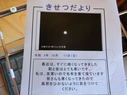 児童玄関に「季節だより」が掲示してあります。6年生の子がタブレットで作った季節だよりが今の時期にぴったりだなと思いながら読みました。風邪をひかないように過ごしたいですね。今日も元気にがんばりましょう!