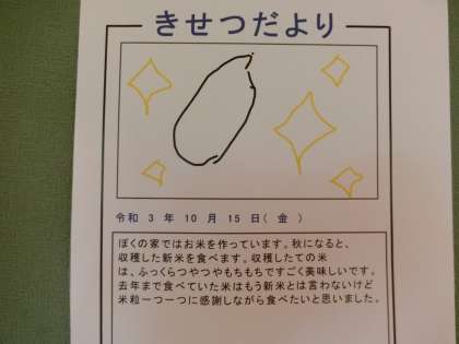すっかり稲刈りも終わって新米がおいしい季節です。「ぼくの家ではお米を作っています。秋になると、収穫した新米を食べます。収穫したての米は、ふっくらつやつやもちもちですごく美味しいです。米粒一つ一つに感謝しながら食べたいと思いました。」ピカピカのお米のイラストです。6年生が作った季節だよりです。