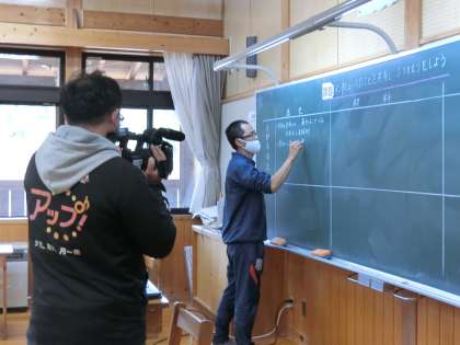 昨日、6年生が吉野屋商店さんに五平餅調査に伺った先で、偶然、取材中のメーテレ(平日の夕方6チャンネルの「アップ」を担当している方)に会いました。その時に子どもたちの活動に興味をもたれて、今日、改めて学校まで取材にみえました。今日の授業では、五平餅調査に行った時のメモをもとにして、わかったことを共有したり、前回のあさぎりさんの五平餅と違うところを発表したりしました。
