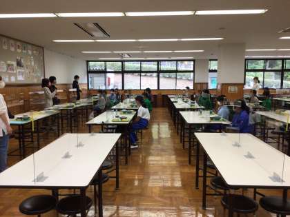 お肉たっぷりのどんぶり。山盛りです。海藻サラダ、かきたま汁、オレンジ。おなかいっぱいになりました。黙食です。3校とも子どもたちは当たり前のように黙食習慣が身についていることを感じました。一緒にキャンプを行うと、日頃の学校生活の様子がよくわかります。いいなと思うのは、先生の話に頷いたり、「はい」と反応する子たちが本校も含めて何人もいることです。お互いの良いところを学んで帰りたいと思います。