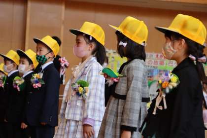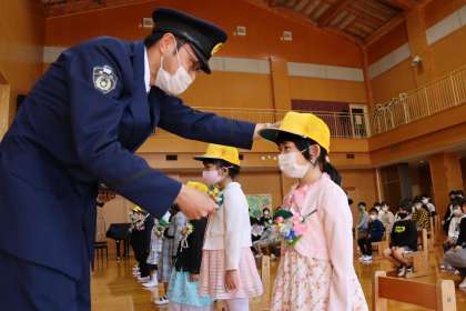 足助警察署黒坂駐在所の工藤様に、交通安全の帽子を一人一人にかぶせていただきました。「交通安全に気を付けて生活してください」と子どもたちにお話してくださいました。